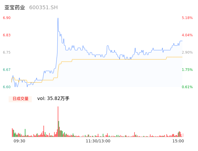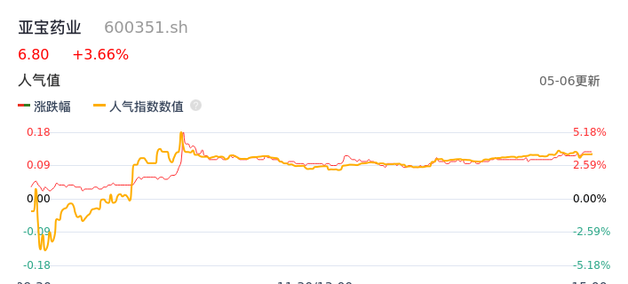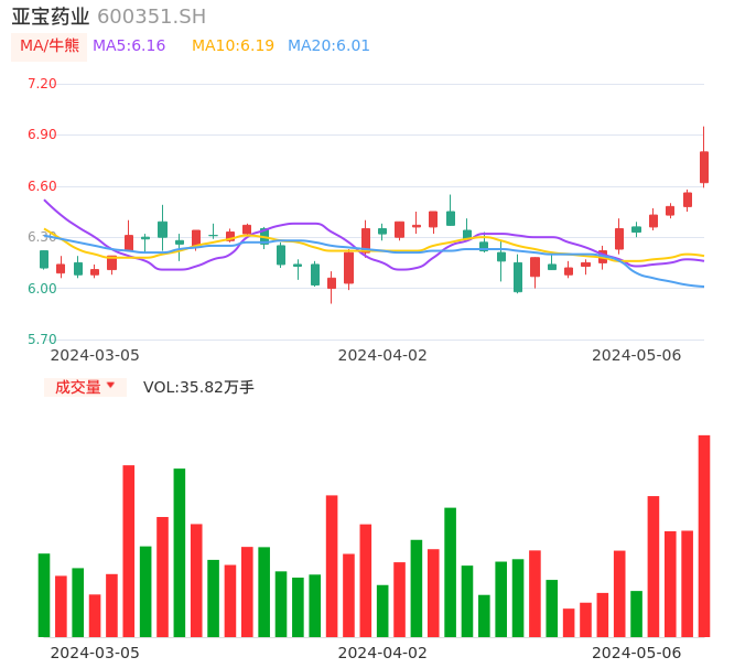05月06日,亚宝药业收报6.80,股价涨幅3.66%,成交金额2.41亿元,换手率4.97%。