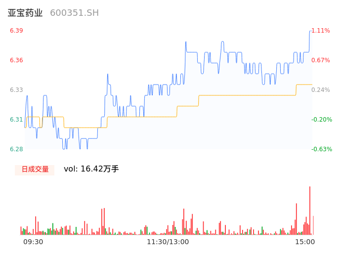 04月03日,亚宝药业收报6.39,股价涨幅1.11%,成交金额1.04亿元,换手率2.13%。