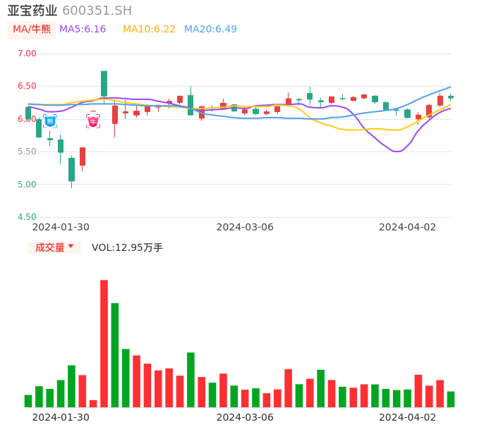04月02日,亚宝药业收报6.32,股价涨幅-0.47%,成交金额8191.10万元,换手率1.68%。