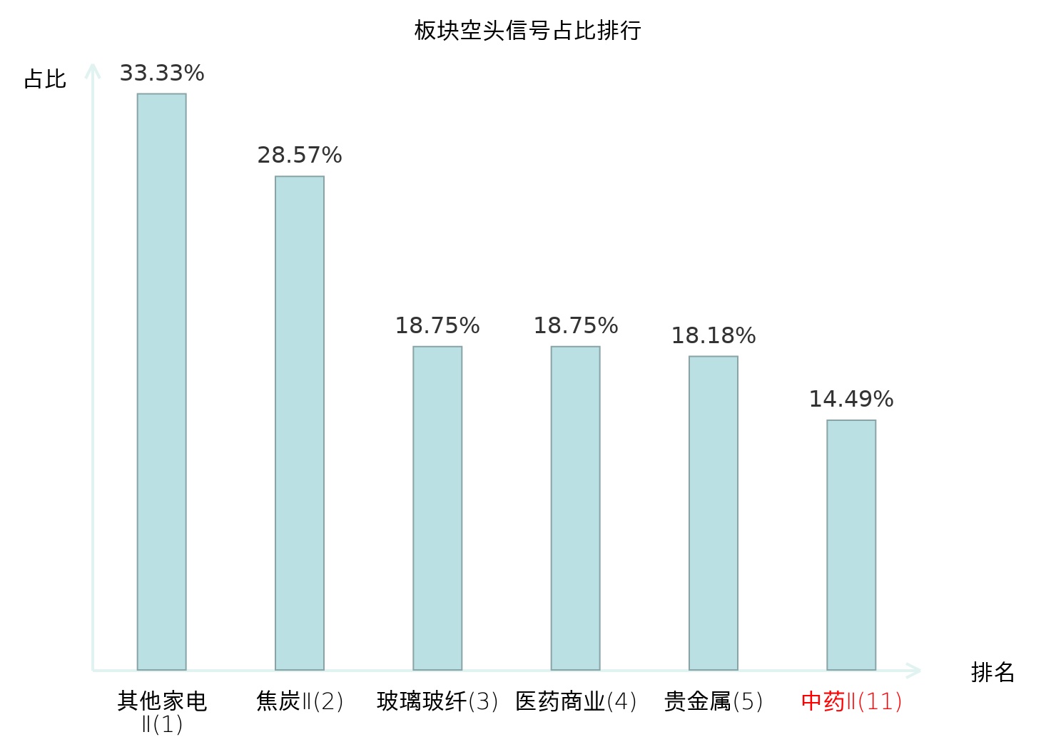全市场所有行业板块中主力空头信号占比排名中,其他家电Ⅱ板块位居第一。工业金属板块名次提升最快,较昨日上升114位。