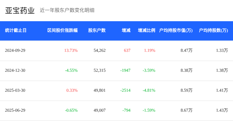 在2025年第二季度,亚宝药业(600351)的股东户数出现了一定的变化。截至2025年6月30日,公司的股东户数为4.90万,较上一季度减少1.59%,户均持股数量环比增加了1.62%,户均持股市值为8.67万元,环比增长了0.95%。