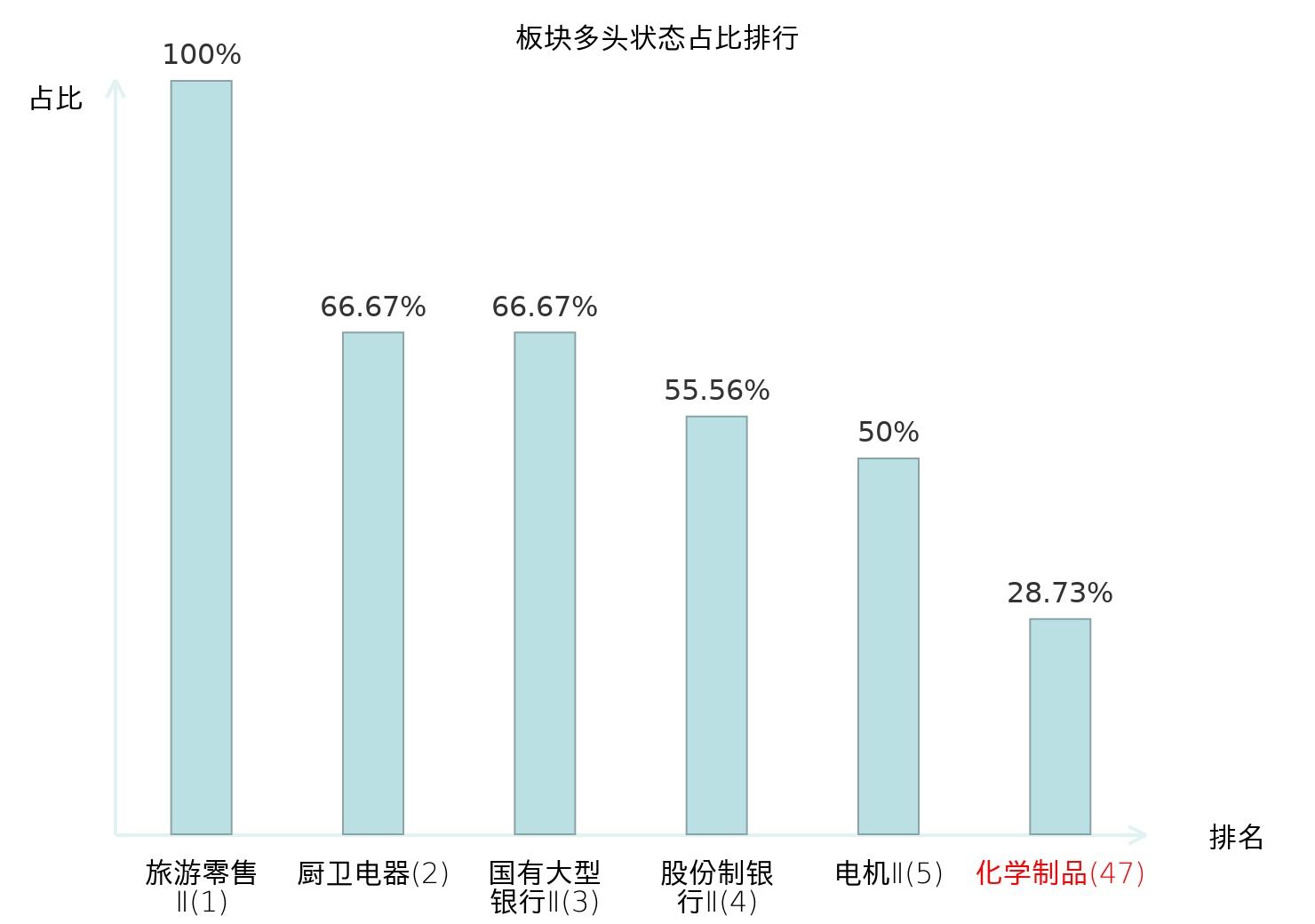 全市场所有行业板块中主力多头状态占比排名中,旅游零售Ⅱ板块位居第一。水泥板块名次提升最快,较昨日上升80位。