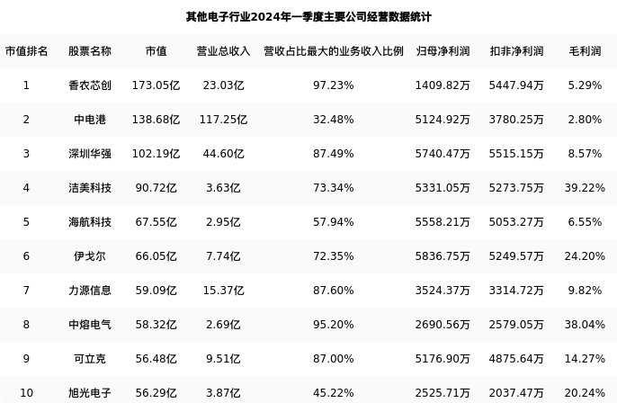 旭光电子最新报告期数据为一季度,下表汇总了其他电子行业内市值靠前的公司一季度主要经营数据