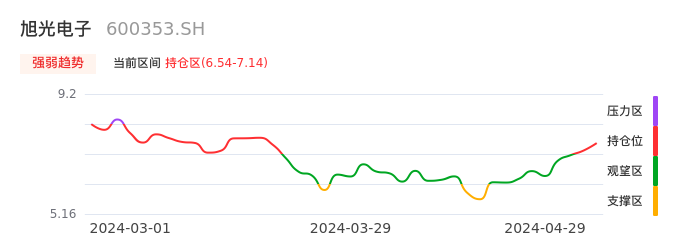 我们来看一下该股的九方特色指标强弱趋势的情况:旭光电子近日从观望区上穿到持仓区。股价短期站稳多头区域,上升动能仍较为充足,可积极关注。后续重点关注上方压力位:7.14元是否能突破上攻。