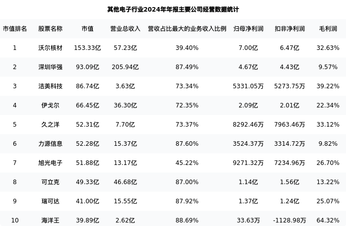 旭光电子最新报告期数据为年报,下表汇总了其他电子行业内市值靠前的公司年报主要经营数据