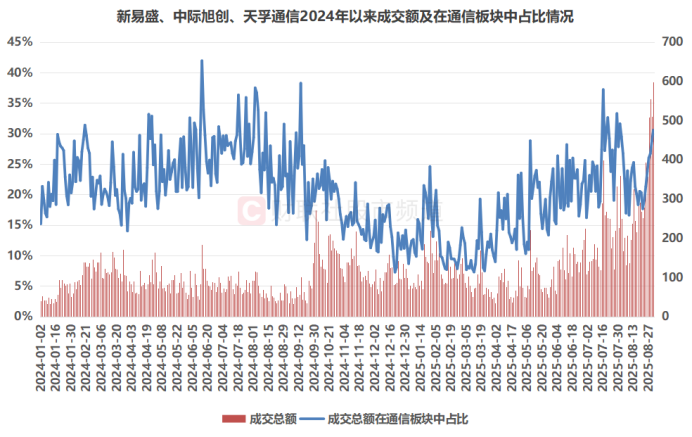 注:新易盛、中际旭创、天孚通信2024年以来成交额及在通信板块中占比情况(截至9月1日收盘)