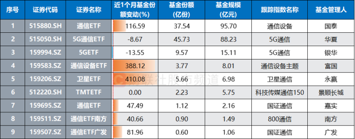 此外,从ETF角度统计,截至8月29日数据,基金规模最大的通信ETF(515880)近1个月基金份额迎来大增,累计增加近116.59%,而基金规模位居第二位、第三位的5G通信ETF(515050)、5GETF(159994)基金份额则唯二显示为下降,降幅分别达8.67%、13.55%。其余通信相关的ETF中,卫星ETF(159206)、通讯设备ETF(159583)也有明显增长。