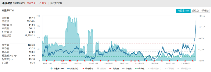 从估值层面来看,截至9月1日数据。以基金规模居前的通信系ETF跟踪的中证全指通信设备(通信设备)、中证5G通信主题(5G通信)指数统计,其两者目前市盈率分别达56.44倍、47.73倍,处于85.14%、97.03%分位点;市盈率分别达6.43倍、5.89倍,处于近十年100%、97.47%分位点。