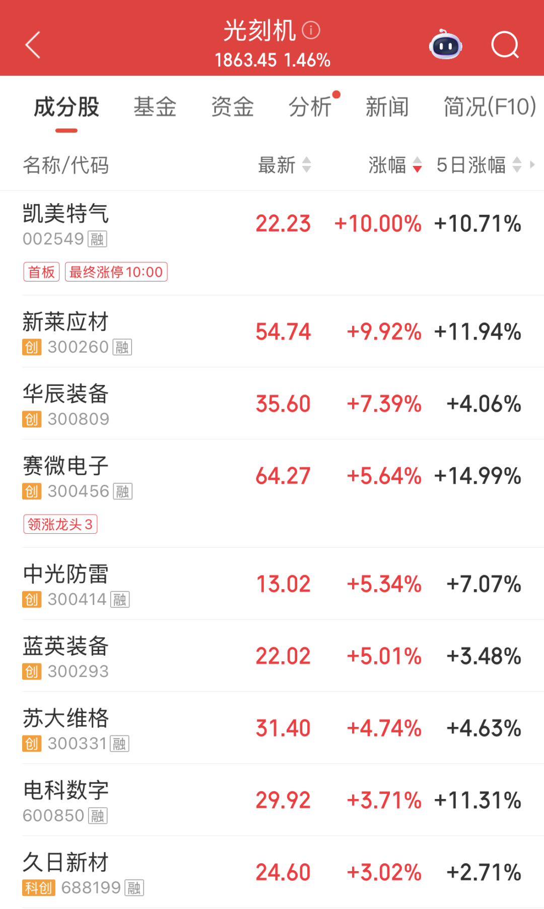 光刻机板块早盘涨势抢眼,凯美特气涨停,新莱应材一度大涨超13%,华辰装备、赛微电子、中光防雷等均大涨超5%。
