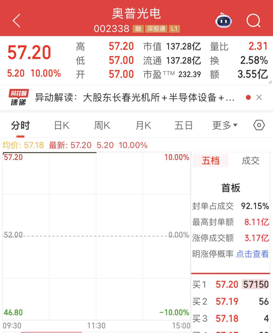 奥普光电早盘以57元/股开盘,较昨日收盘大涨近10%。竞价交易后,该股马上被大单推上涨停板,耗时以秒计。截至上午收盘,该股报收57.2元,上涨10%,封单近5.72万手。