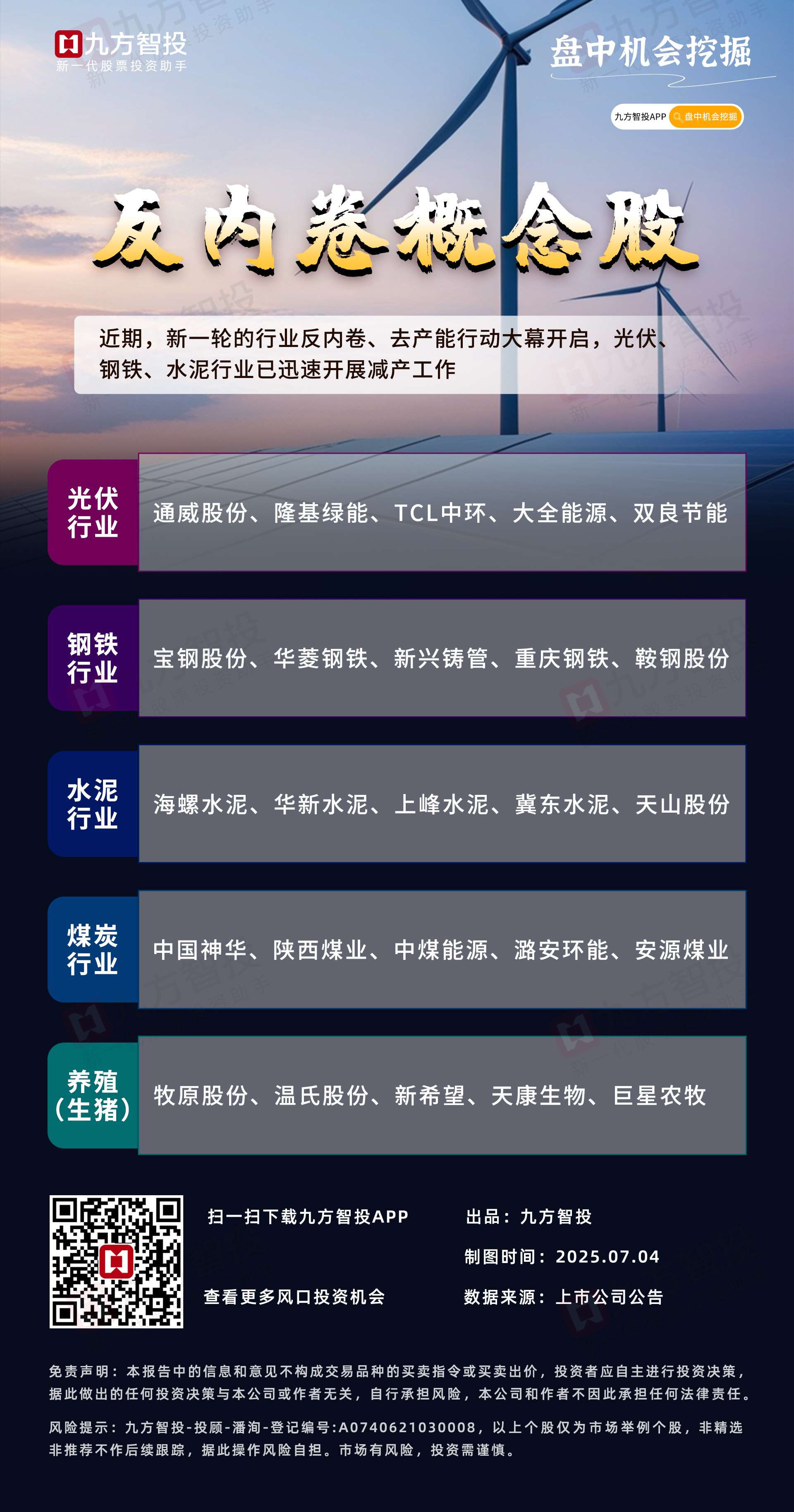 4、海洋经济:会议指出,推动海洋经济高质量发展,要加强顶层设计,加大政策支持力度,鼓励引导社会资本积极参与发展海洋经济。要提高海洋科技自主创新能力,培育发展海洋科技领军企业和专精特新中小企业。 反内卷:近期,新一轮的行业“反内卷”、去产能行动大幕开启,光伏、钢铁、水泥行业已迅速开展减产工作。