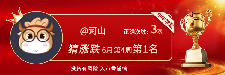 2、大家期待的【猜涨跌】活动已上线,在圈子内点击对话框上方【猜涨跌】了解详情!本周冠军:河山