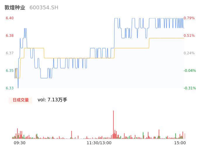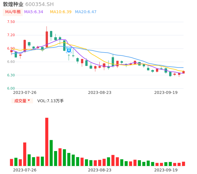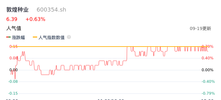 09月19日,敦煌种业收报6.39,股价涨幅0.63%,成交金额4547.28万元,换手率1.35%。