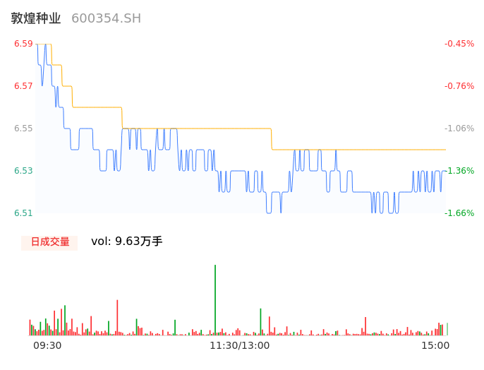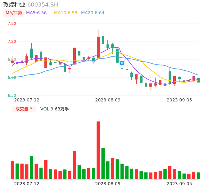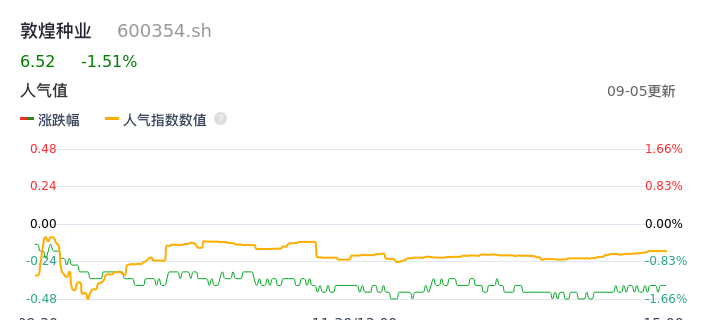 09月05日,敦煌种业收报6.52,股价涨幅-1.51%,成交金额6296.82万元,换手率1.82%。