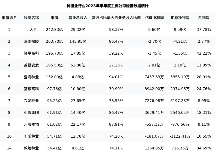 敦煌种业最新报告期数据为半年度,下表汇总了种植业行业内市值靠前的公司半年度主要经营数据