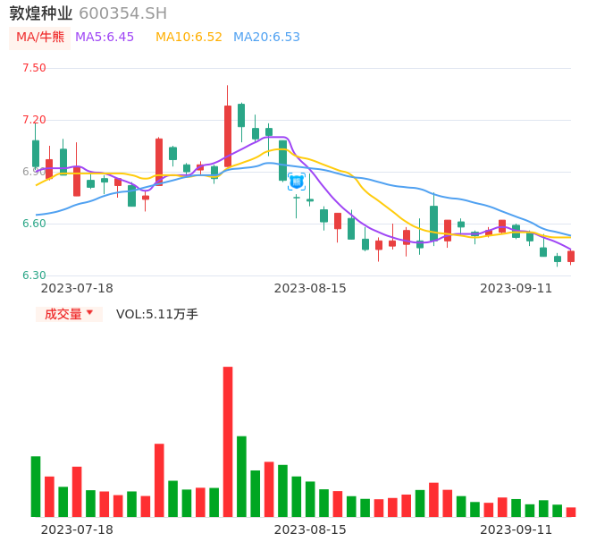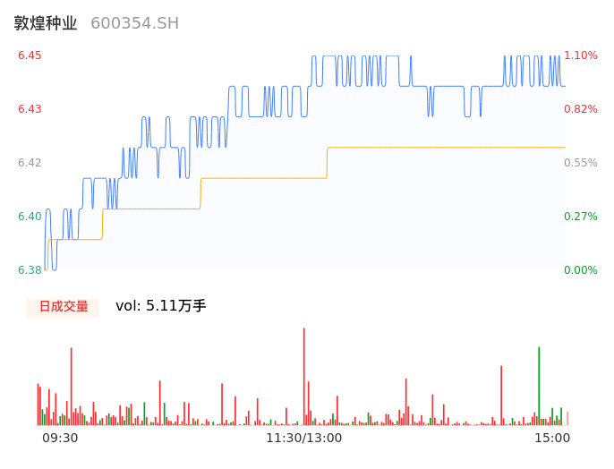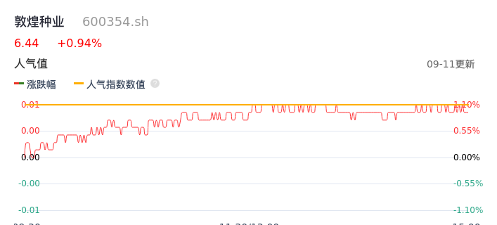 09月11日,敦煌种业收报6.44,股价涨幅0.94%,成交金额3284.11万元,换手率0.97%。