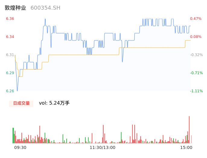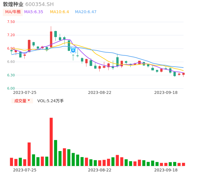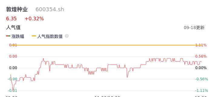 09月18日,敦煌种业收报6.35,股价涨幅0.32%,成交金额3317.87万元,换手率0.99%。