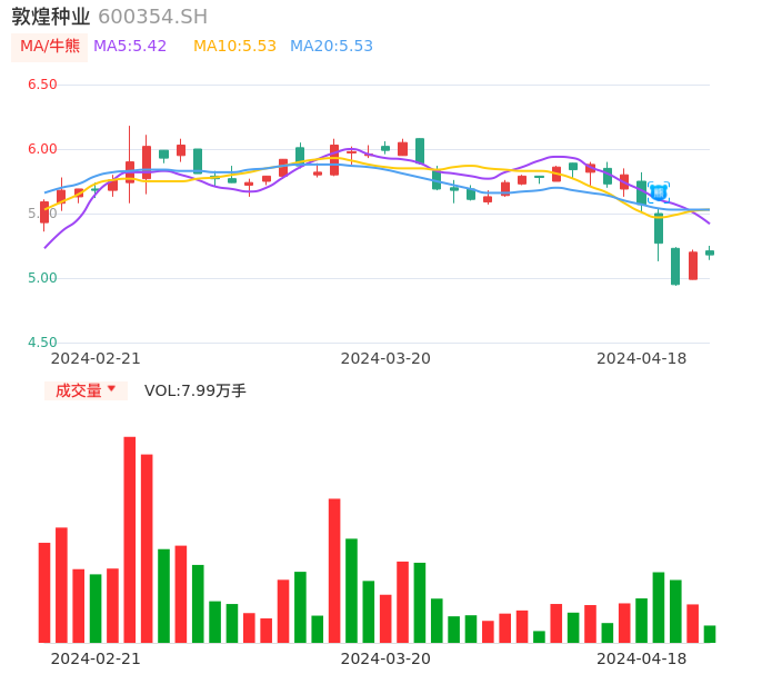 04月18日,敦煌种业收报5.18,股价涨幅-0.38%,成交金额4154.43万元,换手率1.51%。