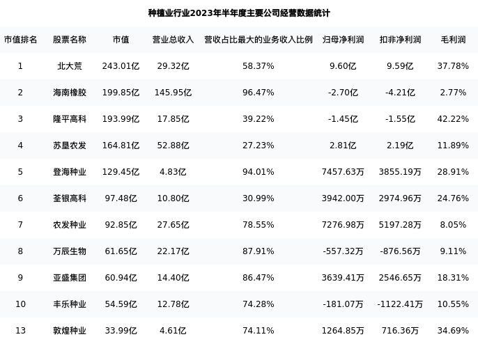 敦煌种业最新报告期数据为半年度,下表汇总了种植业行业内市值靠前的公司半年度主要经营数据