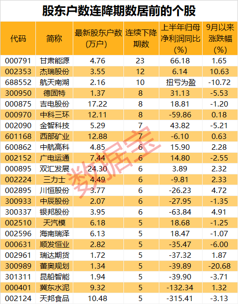 杰瑞股份连降期数仅次于甘肃能源,已连续12期股东户数降低,最新股东户数为3.55万户,累计降幅为31.44%。
