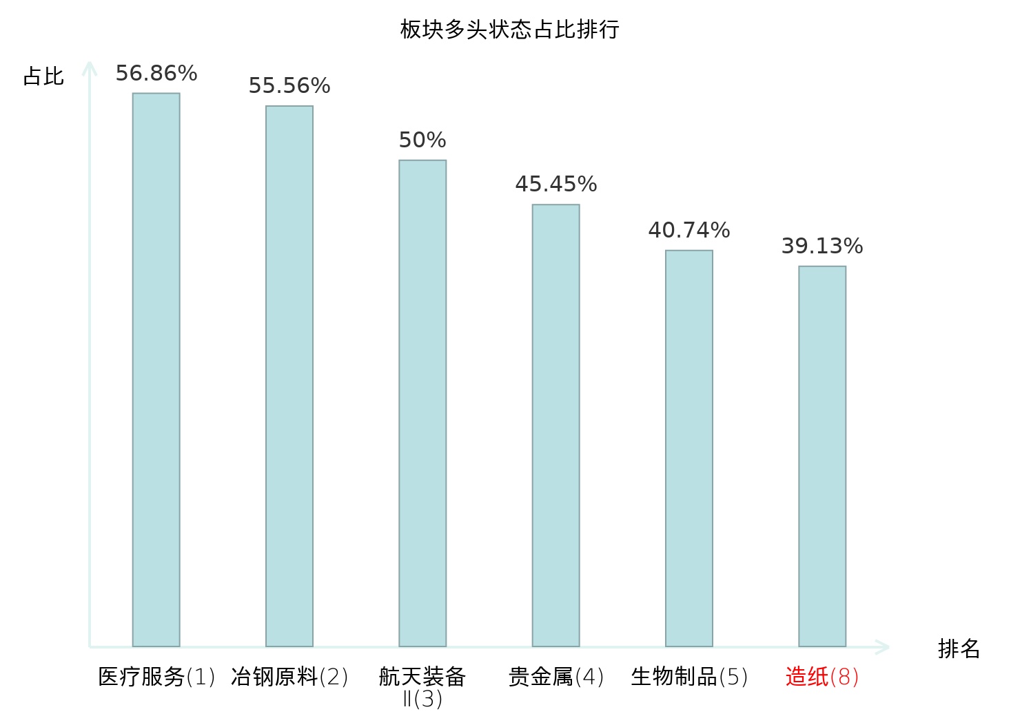 全市场所有行业板块中主力多头状态占比排名中,医疗服务板块位居第一。医疗美容板块名次提升最快,较昨日上升75位。