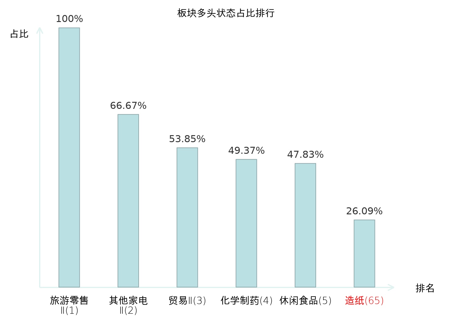 全市场所有行业板块中主力多头状态占比排名中,旅游零售Ⅱ板块位居第一。互联网电商板块名次提升最快,较昨日上升55位。