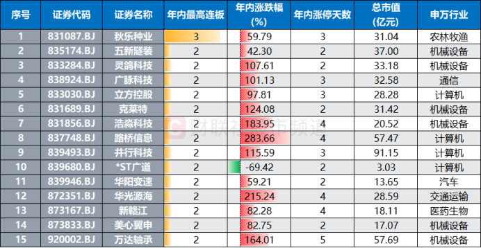 从历史行情上看,北证A股连板情形并不常见,此次*ST广道连获2个30cm涨停,也成为投资者热议话题。仅统计今年以来行情,截至今日(6月26日)收盘,累计共有15只北证A股录得2连板或以上连板,其中,秋乐种业以3连板的高度为年内最高30cm连板纪录。分行业(申万一级)来看,上述这15股主要集中在机械设备、计算机两个板块。