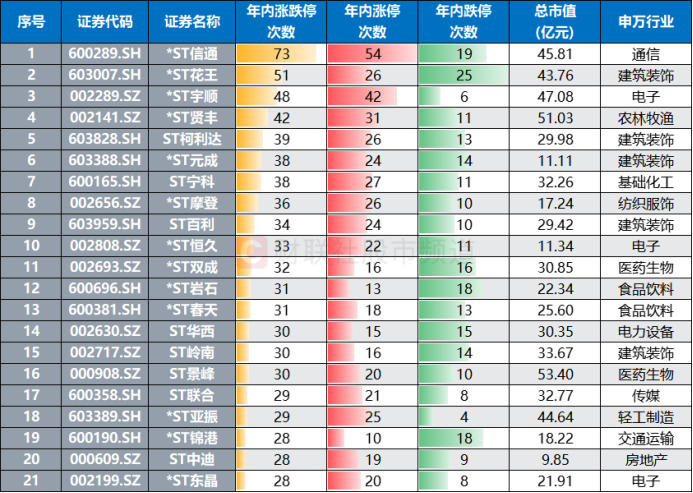 注:年内涨停、跌停次数合计居前的ST股(截至6月26日收盘)