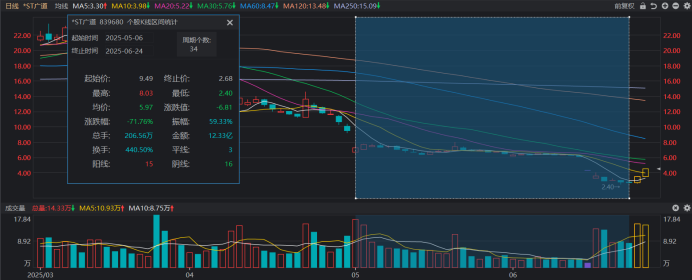 据悉,*ST广道(广道数字)主营数字政务和工业数字化,此前因2024年年度报告被出具了无法表示意见而在今年5月6日被“披星戴帽”。同时,其因涉嫌重大财务造假而于本月中旬收到《行政处罚事先告知书》,可能触及北交所重大违法类强制退市规定。受此影响,*ST广道近期股价接连跳水,截至6月24日收盘,其首次ST以来近1个半月共回撤近七成。