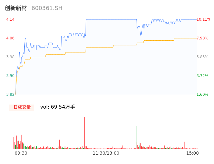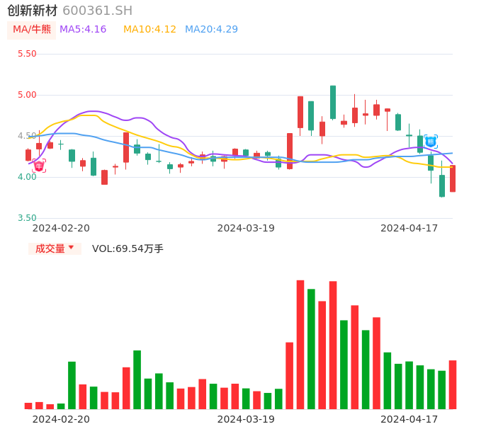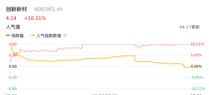 04月17日,创新新材收报4.14,股价涨幅10.11%,成交金额2.82亿元,换手率6.97%。