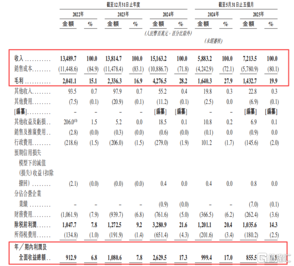 2022年、2023年、2024年及2025年1-5月(报告期),公司的收入分别为134.9亿元、138.15亿元、151.63亿元、72.14亿元,净利润分别为9.13亿元、10.81亿元、26.3亿元、8.56亿元;报告期内毛利率分别为15.1%、16.9%、28.2%、19.9%。