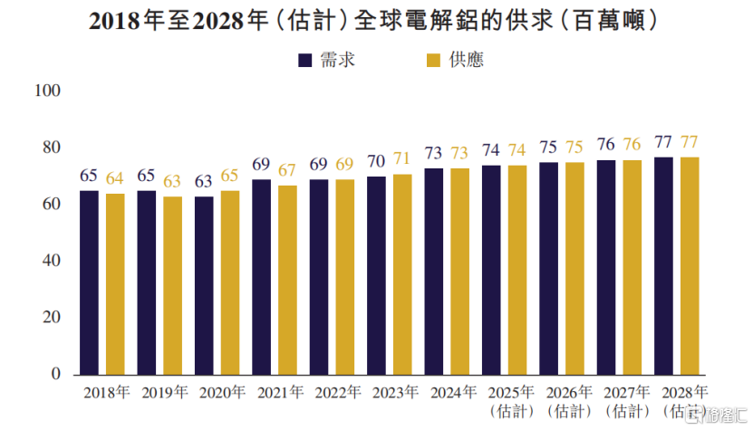 2018年至2028年(估计)全球电解铝的供求(百万吨),来源:招股书