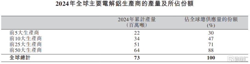 2024年全球主要电解铝生产商的产量及所占份额,来源:招股书