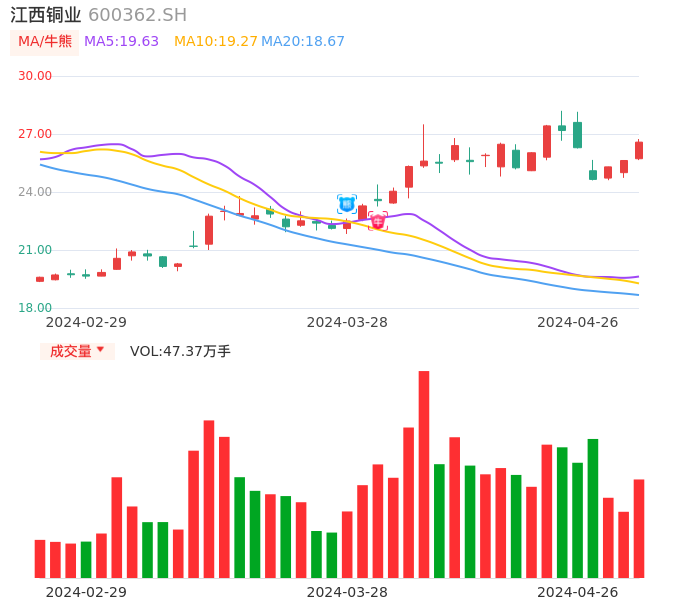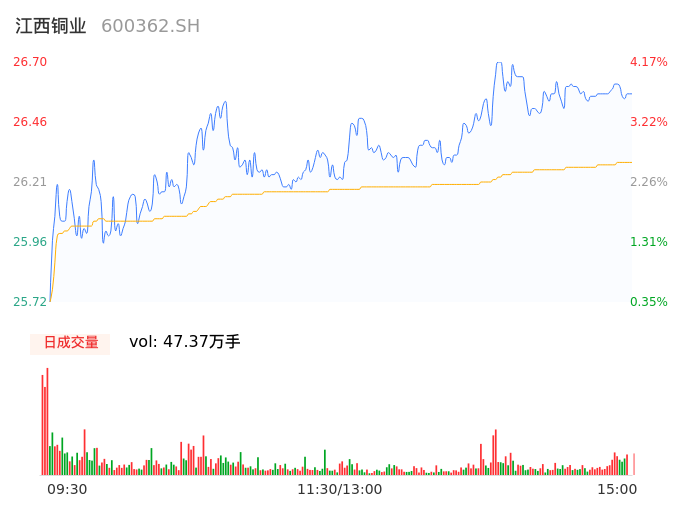 04月26日,江西铜业收报26.58,股价涨幅3.71%,成交金额12.46亿元,换手率2.28%。