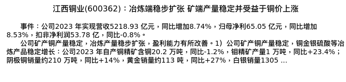 值得注意的是:2024年04月东北证券的曾智勤/聂政分析师,首次发布关于江西铜业的研究报告,标题为:江西铜业(600362):冶炼端稳步扩张 矿端产量稳定并受益于铜价上涨。