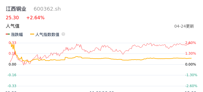 04月24日,江西铜业收报25.30,股价涨幅2.64%,成交金额9.65亿元,换手率1.86%。