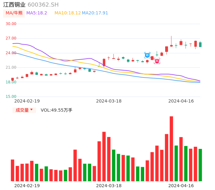 04月16日,江西铜业收报25.25,股价涨幅-4.61%,成交金额12.80亿元,换手率2.39%。
