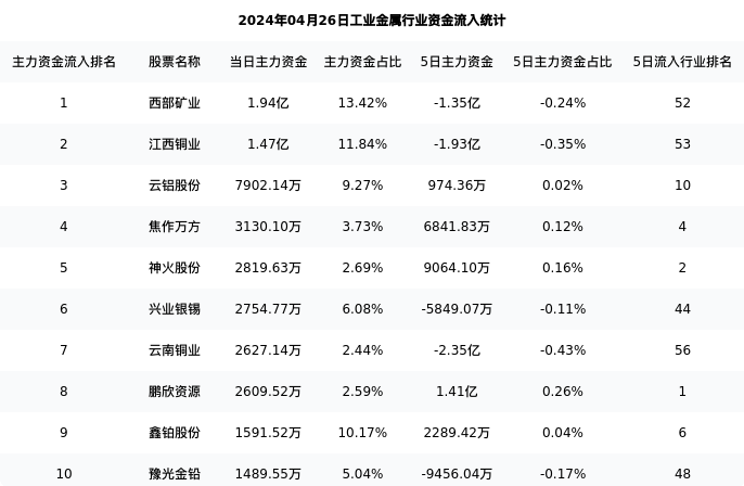 从主力资金流向来看,工业金属行业今日主力资金流入104.25亿元,在所有申万二级行业中排名:51/131。
