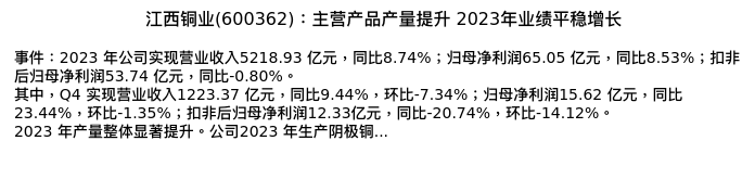值得注意的是:2024年04月首创证券的吴轩/刘崇娜分析师,首次发布关于江西铜业的研究报告,标题为:江西铜业(600362):主营产品产量提升 2023年业绩平稳增长。