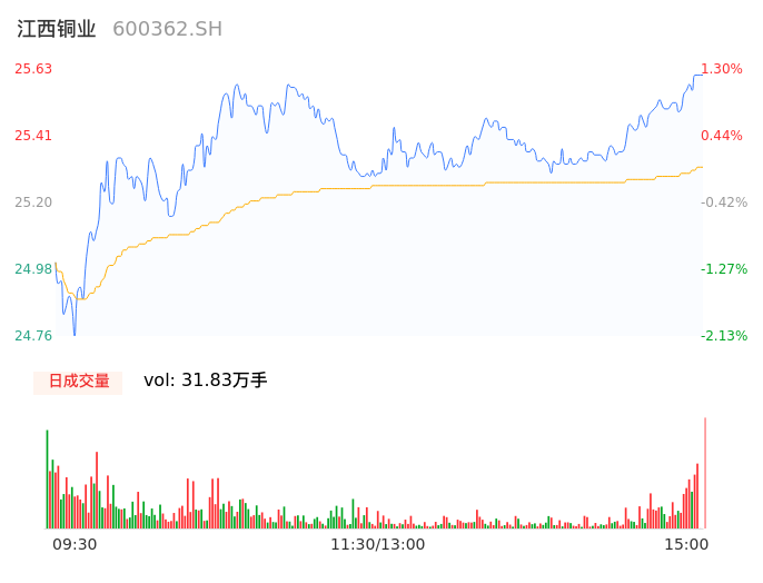 04月25日,江西铜业收报25.63,股价涨幅1.30%,成交金额8.06亿元,换手率1.53%。