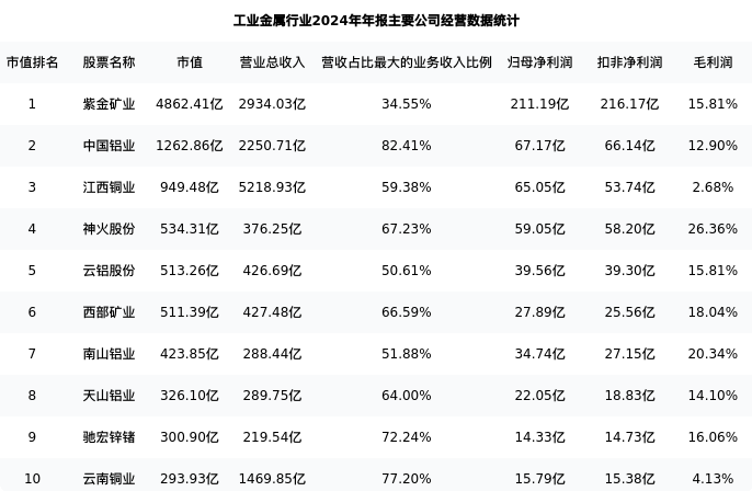 江西铜业最新报告期数据为年报,下表汇总了工业金属行业内市值靠前的公司年报主要经营数据