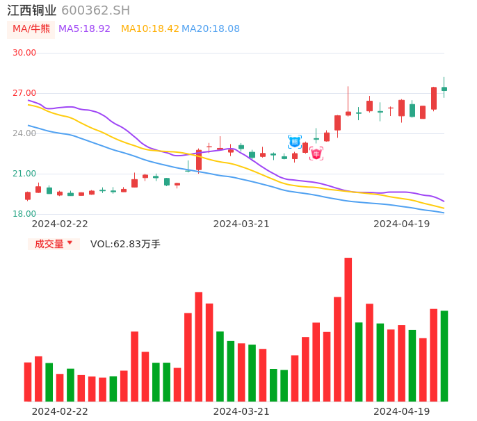 04月19日,江西铜业收报27.18,股价涨幅-0.88%,成交金额17.24亿元,换手率3.03%。
