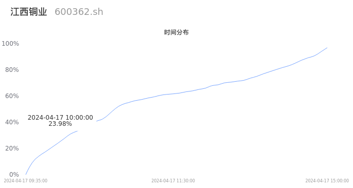 600362江西铜业2024年04月17日成交43.85万手,成交金额11.26亿元,相较昨日缩量5.71万手,换手率2.11%,成交清淡。