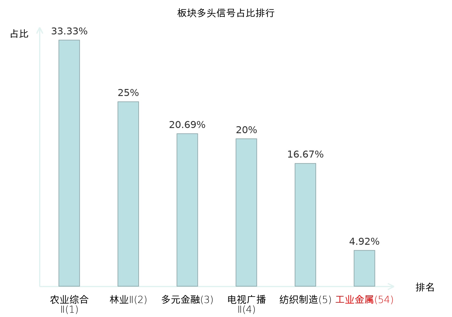 全市场所有行业板块中主力多头信号占比排名中,农业综合Ⅱ板块位居第一。农业综合Ⅱ板块名次提升最快,较昨日上升127位。