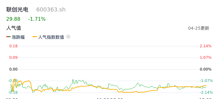 04月25日,联创光电收报29.88,股价涨幅-1.71%,成交金额2.50亿元,换手率1.84%。