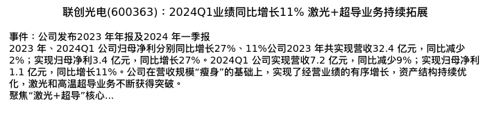 值得注意的是:2024年04月浙商证券的王华君/刘村阳分析师,首次发布关于联创光电的研究报告,标题为:联创光电(600363):2024Q1业绩同比增长11% 激光+超导业务持续拓展。