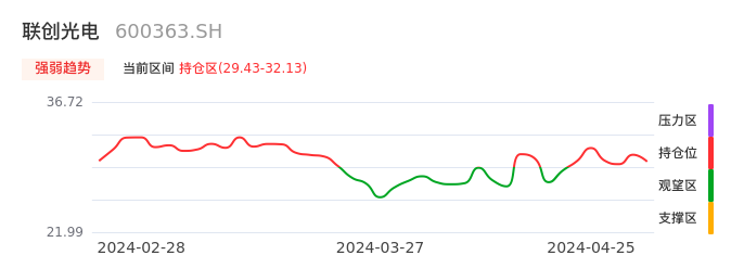我们来看一下该股的九方特色指标强弱趋势的情况:联创光电自04月18日从观望区上穿到持仓区。股价近期在多头区域回调整理。后续重点关注多空分界点的争夺:29.43元。如未能有效站稳则可能重新回到空头行情。