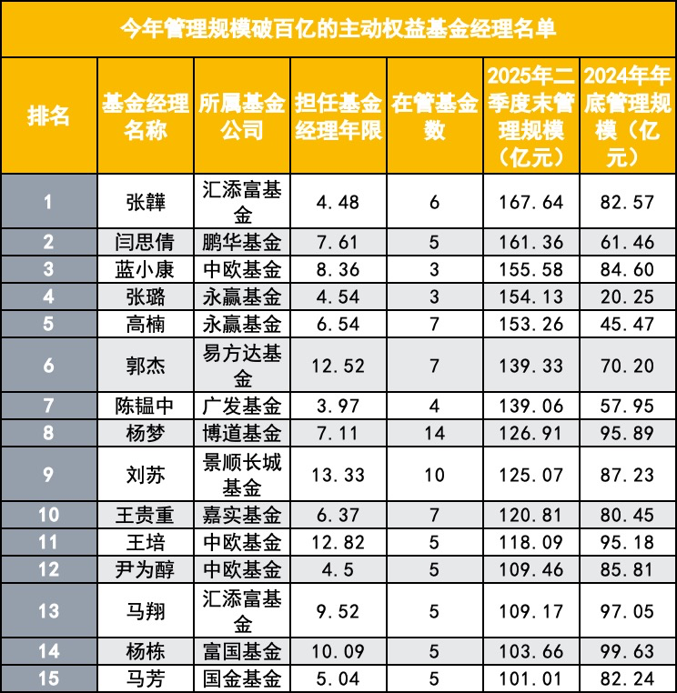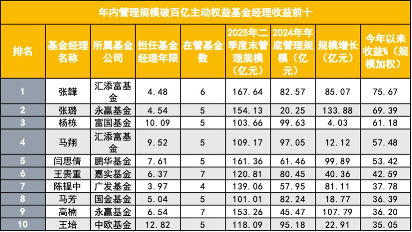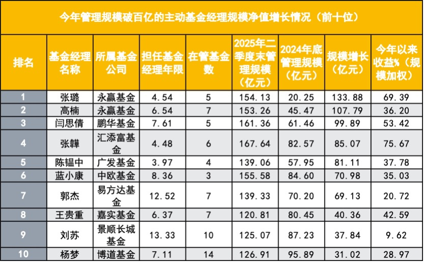 根据公募排排网数据统计,截至2025年二季度末,百亿级主动权益基金经理人数达到84位,较2024年末新增15位。其中,不乏此前管理规模仅二三十亿元的基金经理,如今已完成数倍扩容。张璐、张韡、杨栋等人,正是在这一轮行情中凭借业绩带动资金涌入,实现从新星到百亿的跃升。