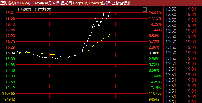值得注意的是,稀土永磁指数上涨超2%,成份股中宁波韵升涨停,正海磁材(300224)一度直线20%涨停,龙磁科技涨超10%,中科磁业、金力永磁等大涨。