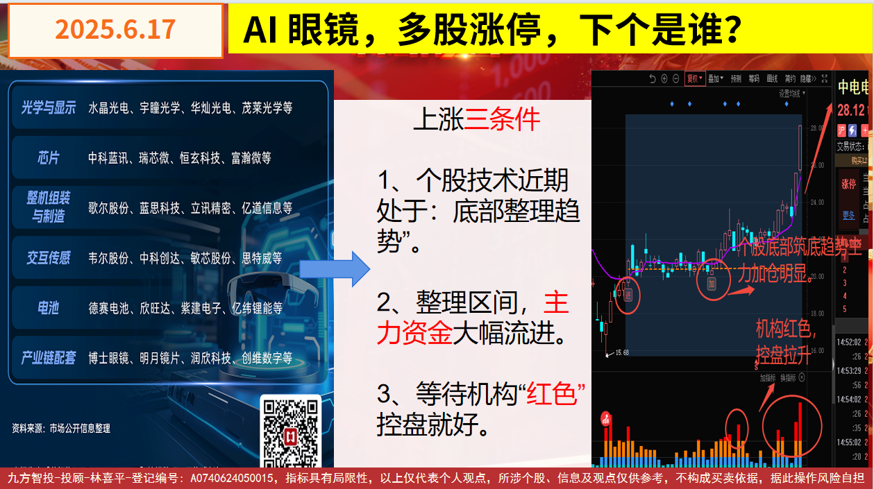 2、题材演绎上:留意AI眼镜方向,逻辑是:事件催化不断,另外个股处于低位,且有主力加仓。
